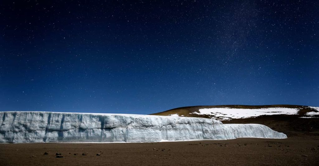 Tra i 5000 e 5895 mt della vetta i detriti ghiaiosi lasciano spazio ai primi nevai, che si trasformano in banchi di ghiaccio intorno al cratere sommitale. Vento gelido, raggi UV intensi, poco ossigeno, notti a meno 15 ยฐC.